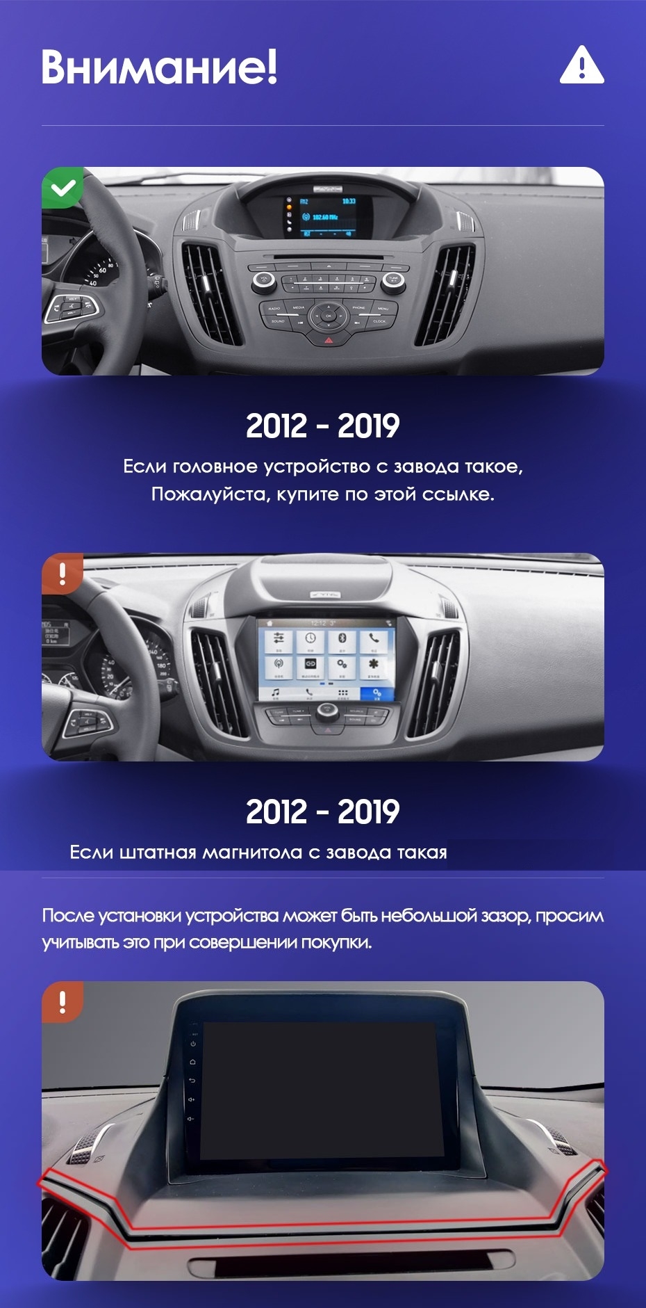 Установочный комплект для Ford Kuga 2 (2012-2019) включает переходную рамку и проводку.