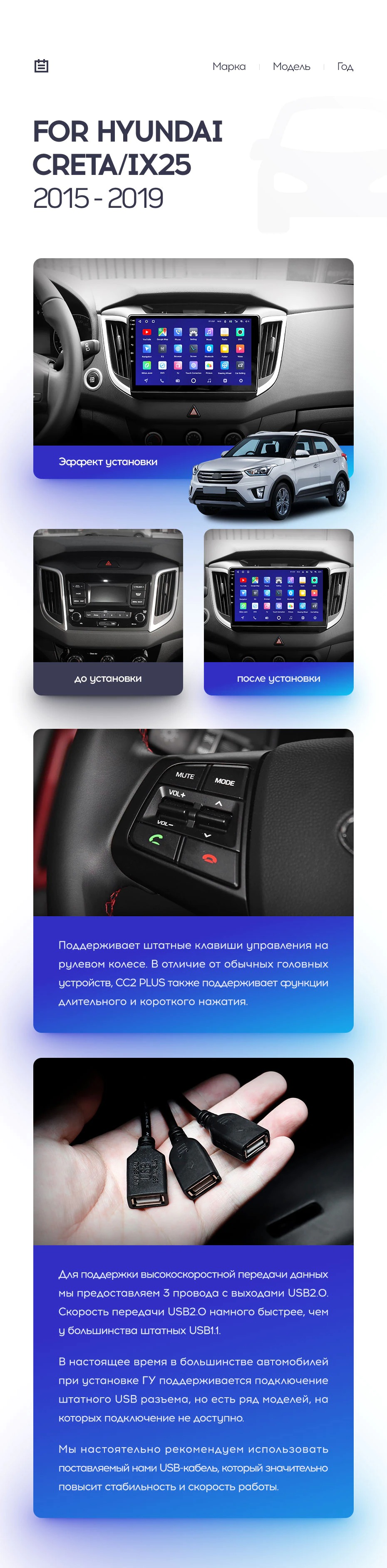 Полный комплект установки магнитолы Teyes с рамкой и проводкой можно выбрать в каталоге штатных магнитол Hyundai Creta (2015-2020).