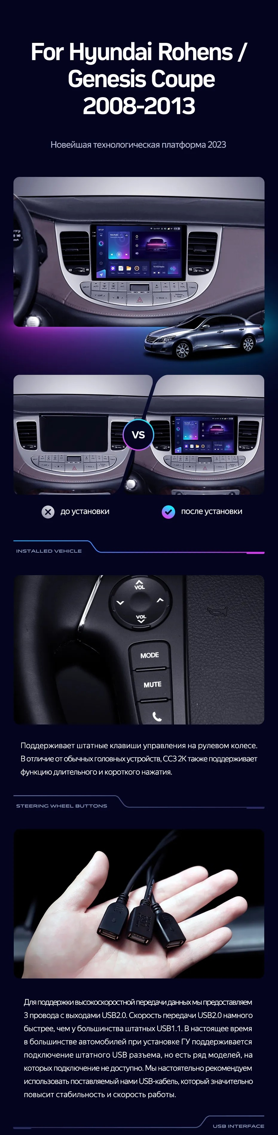 Полный комплект установки магнитолы Teyes с рамкой и проводкой можно выбрать в каталоге штатных магнитол Hyundai Rohens Genesis (2008-2013).