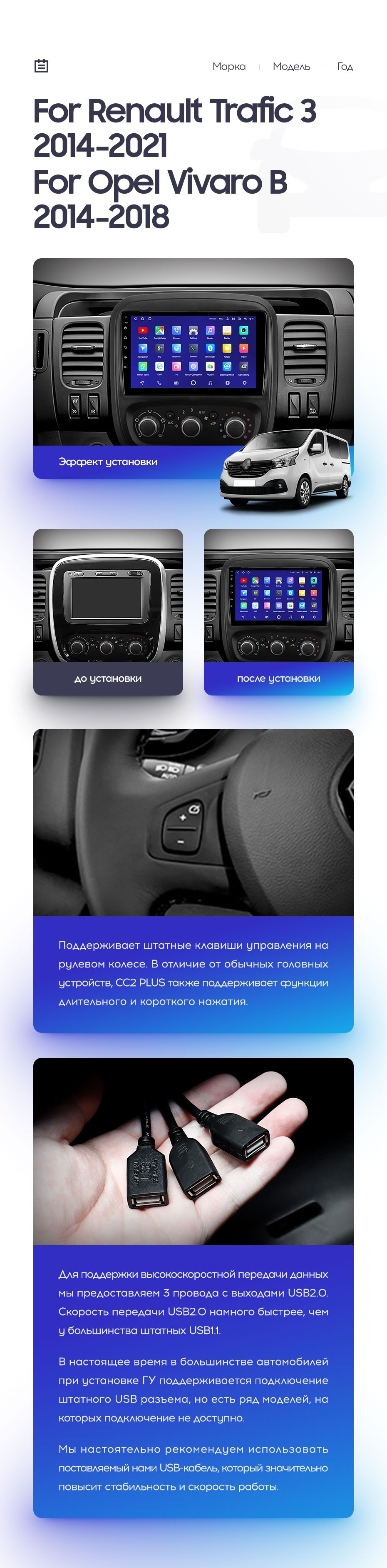 Полный комплект установки магнитолы Teyes с рамкой и проводкой можно выбрать в каталоге штатных магнитол Opel Vivaro B (2014-2018).