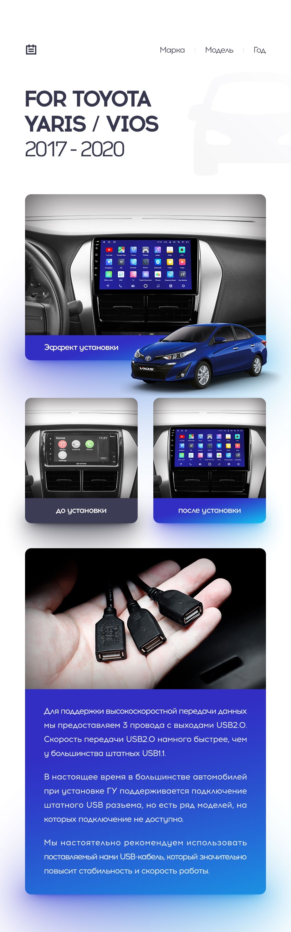 Полный комплект установки магнитолы Teyes с рамкой и проводкой можно выбрать в каталоге штатных магнитол Toyota Yaris (2017-2020).