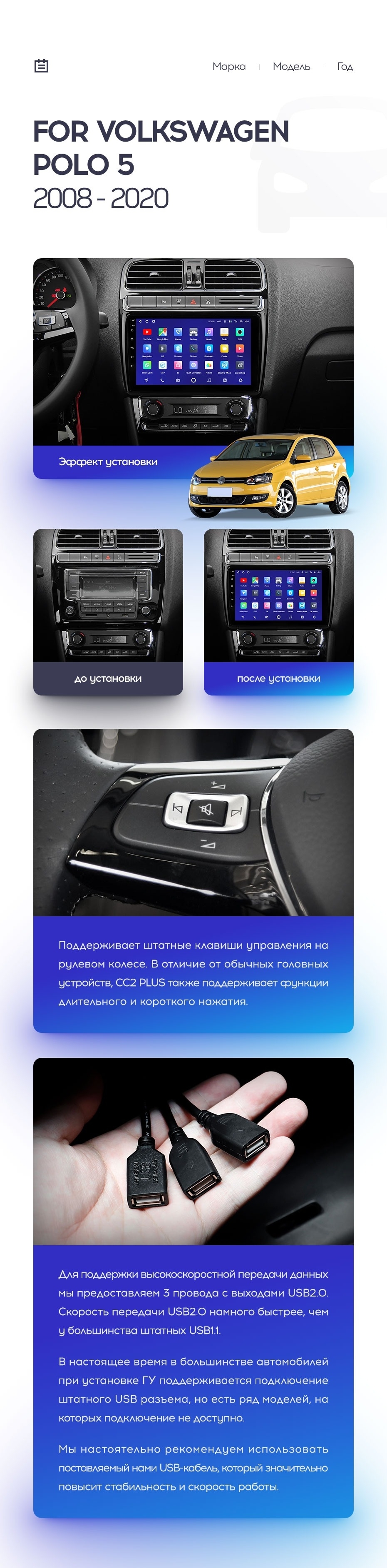 Установочный комплект для Volkswagen Polo 5 (2008-2020) включает переходную рамку и проводку.
