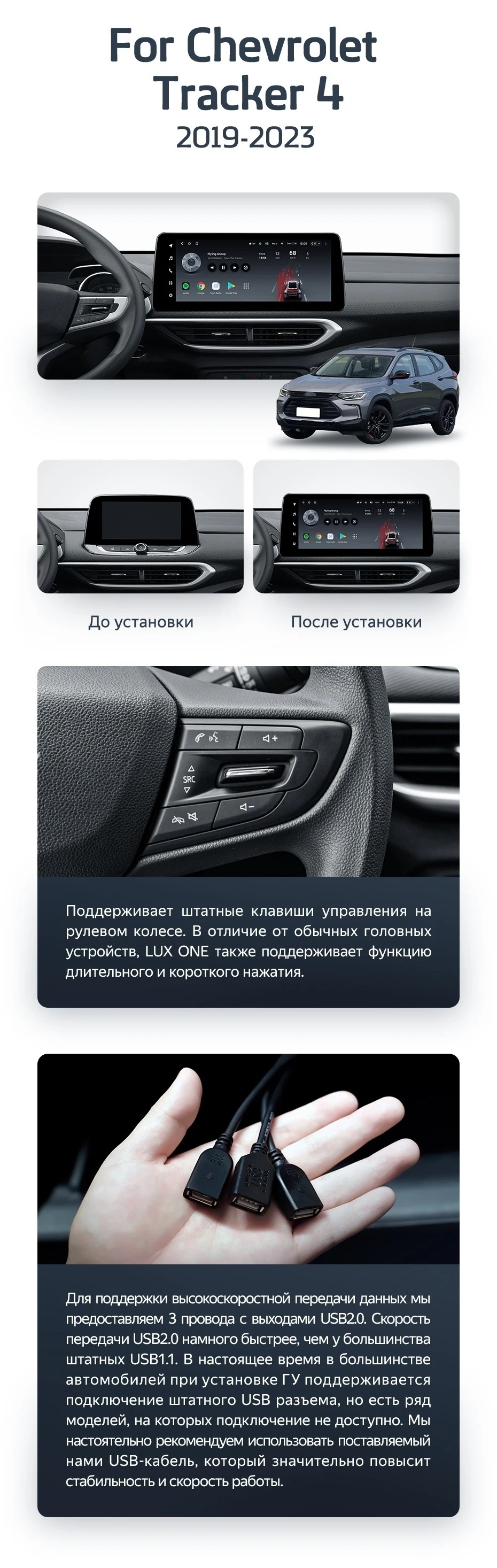 Полный комплект установки магнитолы Teyes с рамкой и проводкой можно выбрать в каталоге штатных магнитол Chevrolet Tracker 4 (2019-2023).